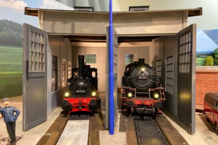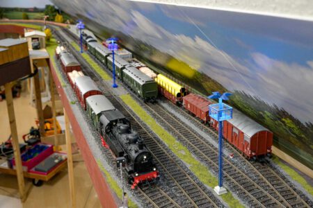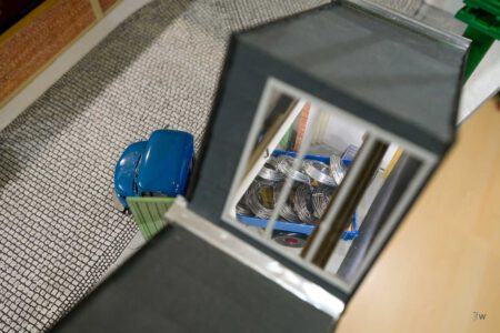 Dabei habe ich umgesetzt, was mir vorschwebte: Eine zweigleisige Rundanlage mit einer Kreuzungsweiche als Engstelle sowie einem großzügigen doppelgleisigen Bahnhof, viele Abstellgleise und vor allem reichlich Rangiermöglichkeiten inkl. Umfahrgleisen. Denn rangieren bringt die größe Variantenvielfalt und macht mir am meisten Spaß. Dazu habe ich mir ein Zufallsprinzip überlegt, durch welches Rangieraufträge erwürfelt werden.